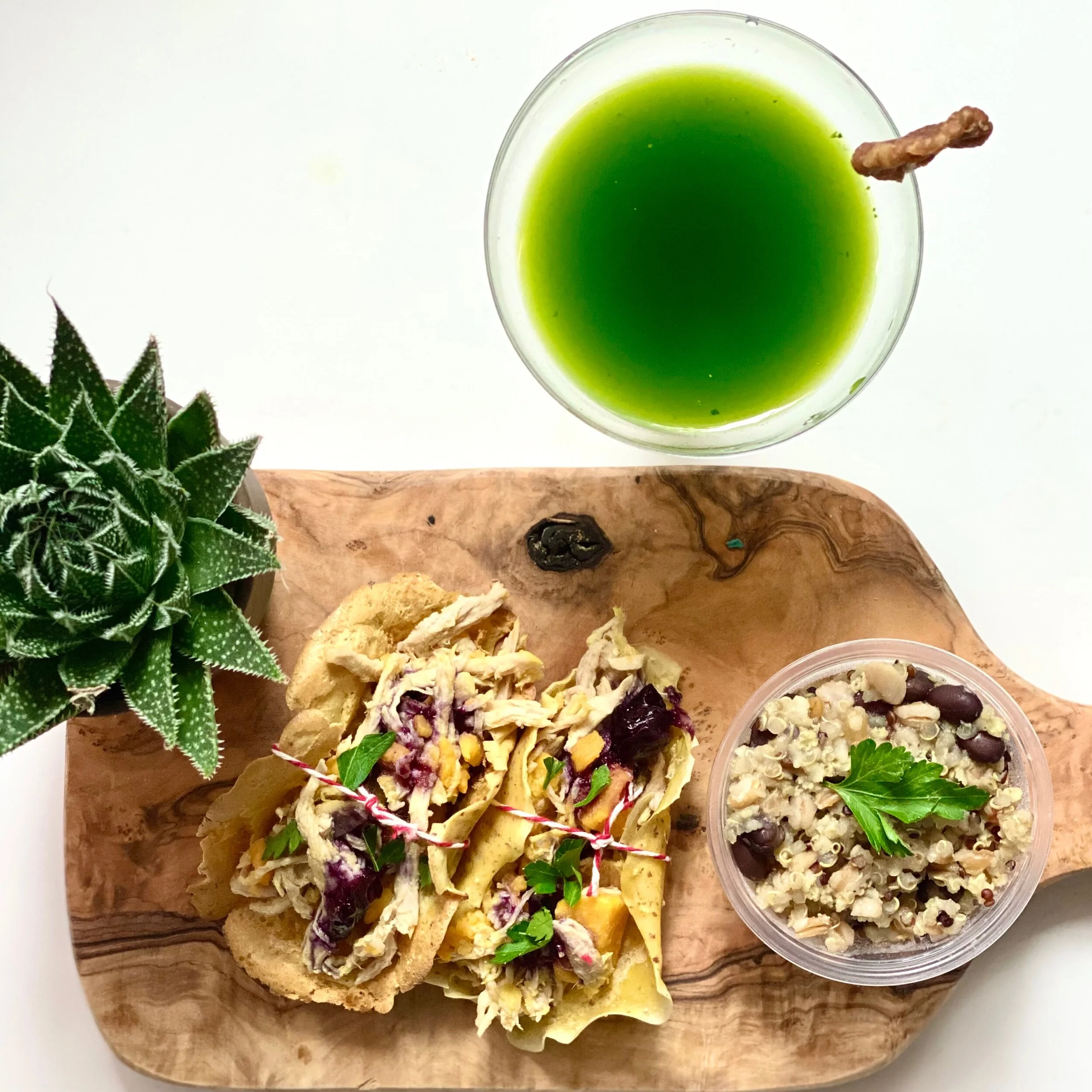 These are served with our homemade vegan and gluten-free chickpea flour soft taco shells. What’s a taco without a side of rice and beans (farro, millet, quinoa, and black beans) and our barkarita cookie. Each order comes with two tacos.